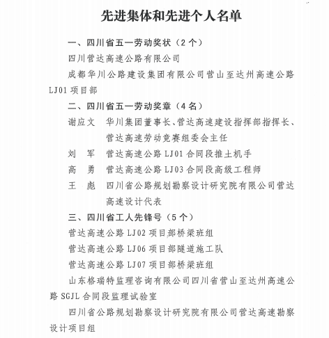 近日,營達高速公路建設勞動競賽得到四川省總工會的表揚,集團董事長謝應文等先進個人和集體獲省“五一勞動獎章”、“五一勞動獎狀”、“工人先鋒號”等獎勵。