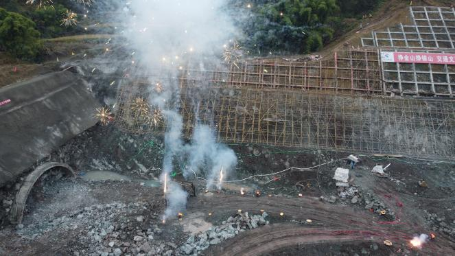 12月2日上午8時,禮花與鞭炮齊鳴,拉開了鐵山隧道出口左洞進洞儀式的帷幕。8點08分,隨著一聲炮響,繞西高速項目西外支線鐵山隧道出口端順利進洞。